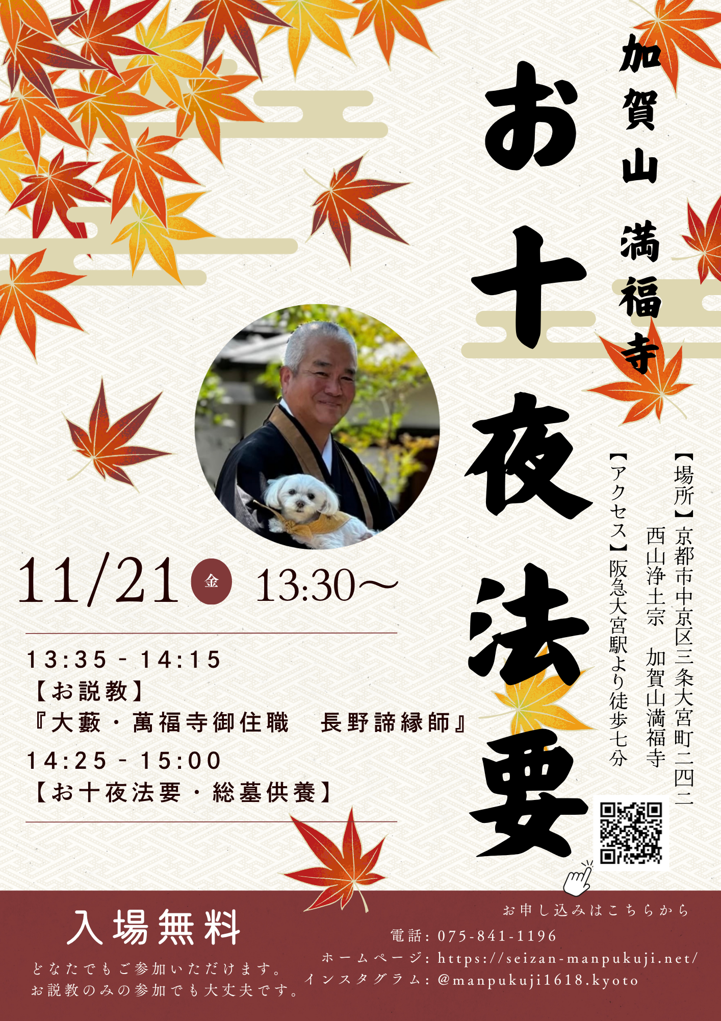 | 2025年10月28日【十夜会法要】 | 令和7年11月21日(金) 13:30~ 於:満福寺 ※お説教のみのご参加も可能です。お説教に参加していただいた方、先着10名様限定で『書置きコラボ御朱印』を頒布いたします。 お参りお待ちしております。