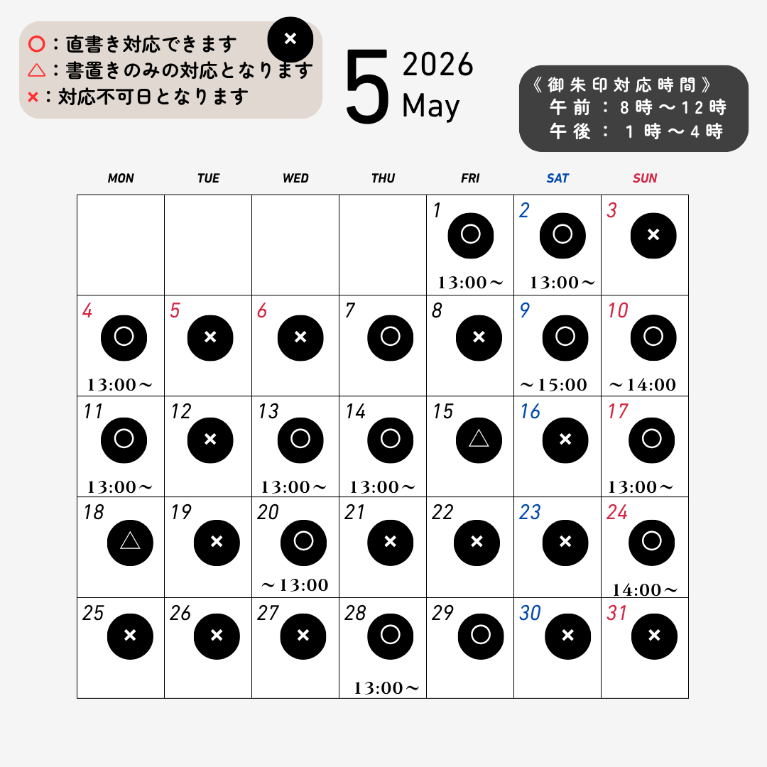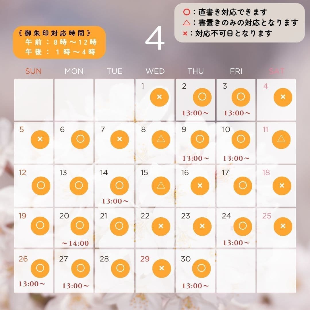 | 2026年3月28日 | 令和8年4月の御朱印カレンダーをアップいたしました。 ★ご予約がないと直書き対応はできません。また、御朱印のご予約は電話・InstagramのDMでも受け付けております。