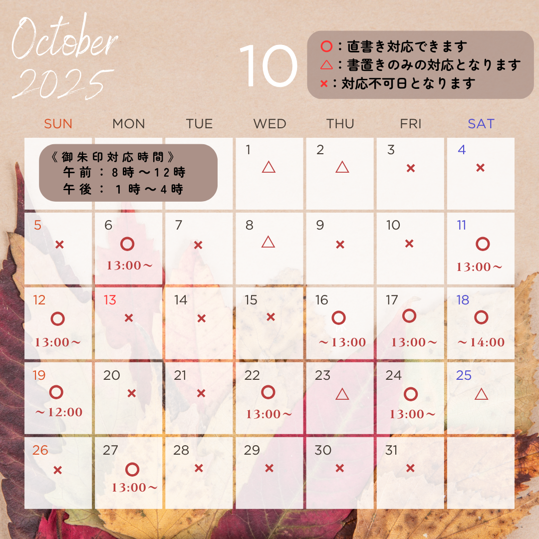 2025年9月30日 | 10月の御朱印カレンダーをアップしました。 ![]() 御朱印のご予約はこちらからお願いいたします。 御朱印のご予約は電話・InstagramのDMでも受け付けております。 |