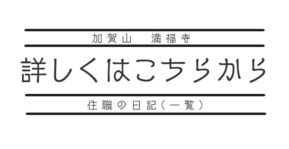 | 2025年2月9日 | 満福寺令和大改修工事プロジェクトにたくさんのご支援いただきましてありがとうございます。引き続き、満福寺を日本一幸せになれるお寺にしていくために楽しむ気持ちを大切に精進してまいります。 |